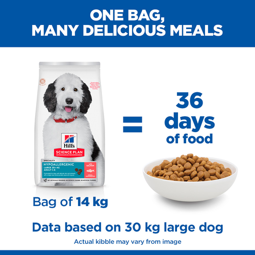 Hill's Science Plan HYPOALLERGENIC Large Breed Adult dog food with Salmon is a gentle recipe formulated with limited high quality novel protein sources & no grain tailored to help your dog avoid common sensitivity triggers.